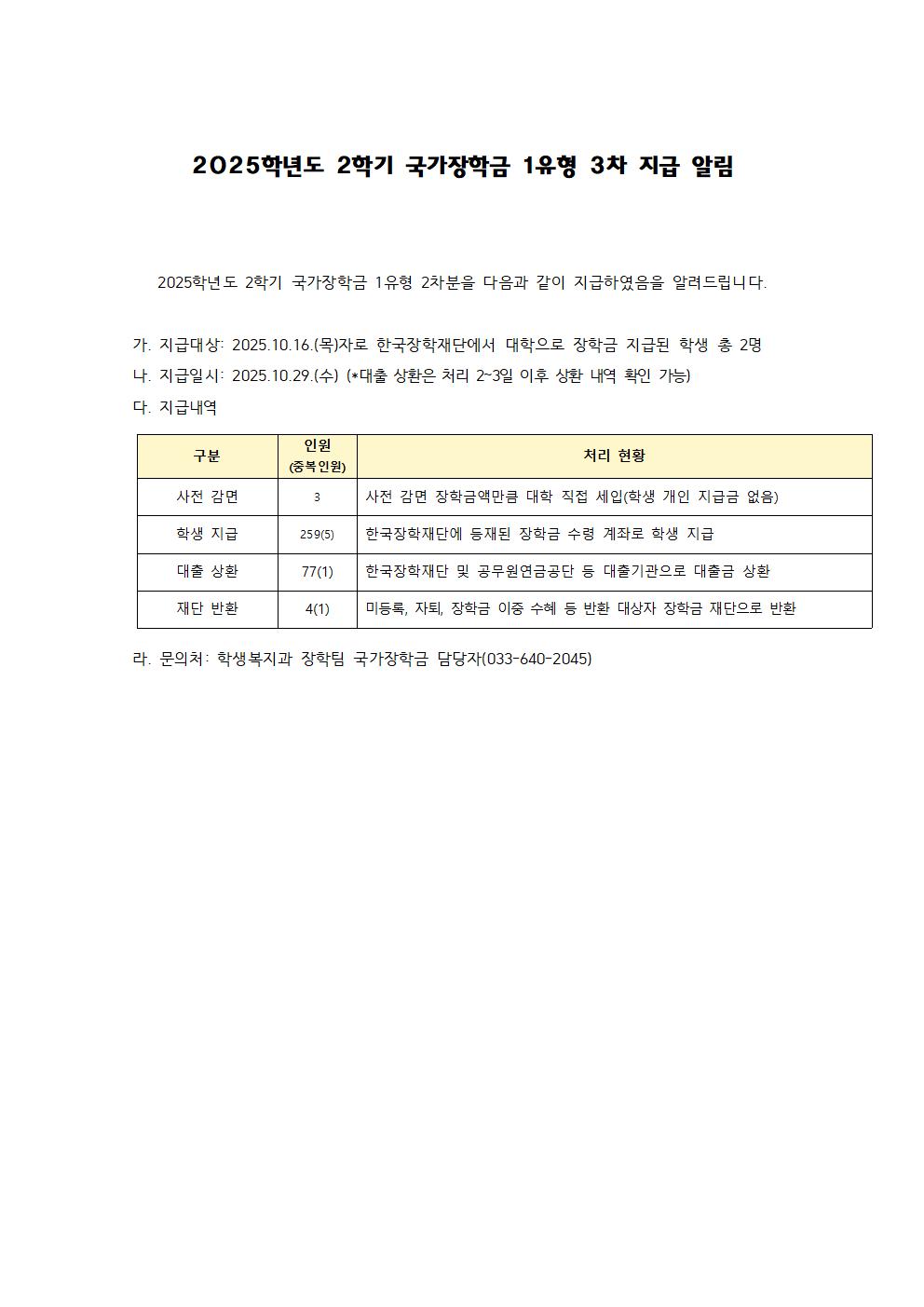 2025학년도 2학기 국가장학금 1유형 3차 지급 알림